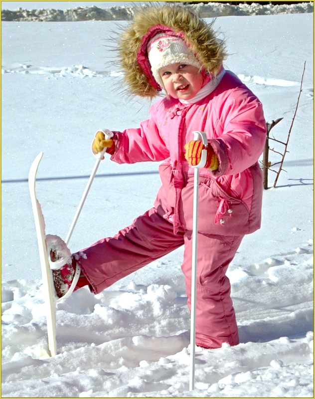 Первое упражнение. Хождение по прямой шагом с переходом к скользящему движению (тогда лыжи не отрывают от лыжни). Затем буксировка, когда ребенок сам держится за палки, а его тянет взрослый, - полезное упражнение, только для обучения детей стойке на первых порах. В первоначальном комплексе и обучение развороту.